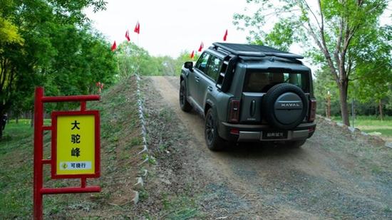前面几个项目都是毛毛雨、洒洒水,接下来就是大家都爱看的重头戏大驼峰和交叉轴还有炮弹坑了。不过就算是大驼峰,对于哈弗猛龙燃油版也是没有什么压力,毕竟接近角、离去角还有离地间隙的数据在那摆着,而且385牛·米的最大扭矩也十分够用,轻轻松松就爬上了大驼峰。但是我还是必须要夸一下全景影像,在爬大驼峰的时候,驾驶员的视野基本上是看天的,所以前置摄像头就充当了眼睛的角色,这一点在越野的时候还是非常贴心的。