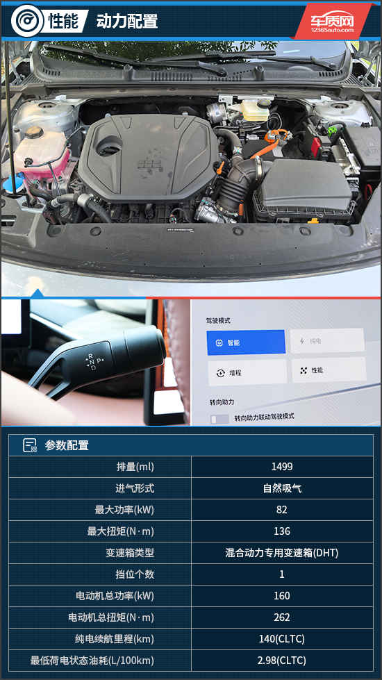 评测车搭载雷神EM-i混动系统,由1.5L电混专用发动机与前置单电机组成。其中,发动机热效率高达46.5%,匹配E-DHT智能无级11合1电驱,官方公布的CLTC工况最低荷电状态油耗为2.98L/100km。