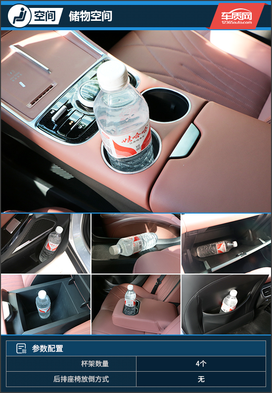 储物空间方面,前后门板储物格开口相对较大,方便拿放物品;中央扶手箱容积较为可观,底部还配备了防滑橡胶垫,细节考虑周到;后排中央扶手虽未配备储物格,但在后排空调出风口下方提供了开放式储物空间,方便放置手机等随身物品。