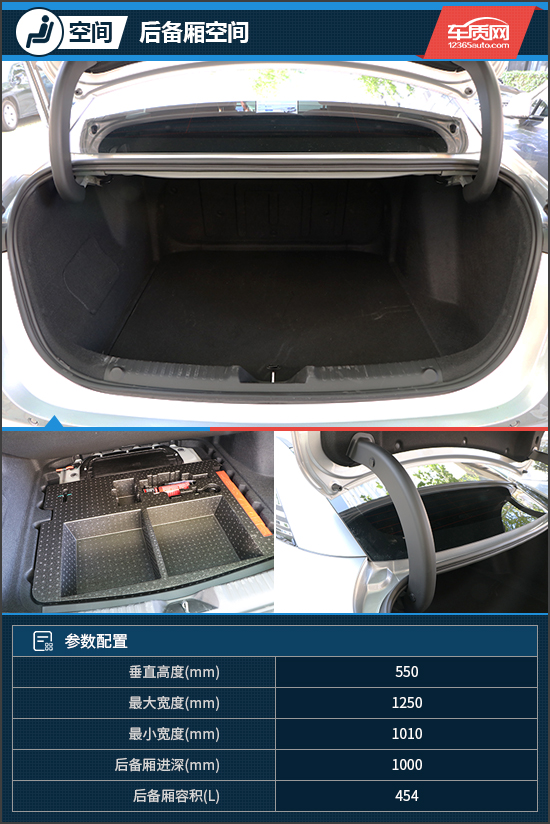 后备厢地板平整度不错,内部造型也十分规整,官方公布的后备厢容积为454L。遗憾的是,后排座椅不支持放倒,后备厢空间延展性受到影响。