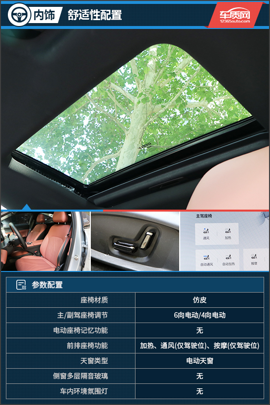舒适性配置方面,评测车配备普通电动天窗和物理遮阳帘,可以有效隔绝紫外线,提供不错的防晒效果。前排座椅支持电动调节,主驾驶座椅还带有加热、通风、按摩功能,提供舒适的乘坐体验。