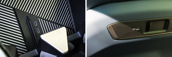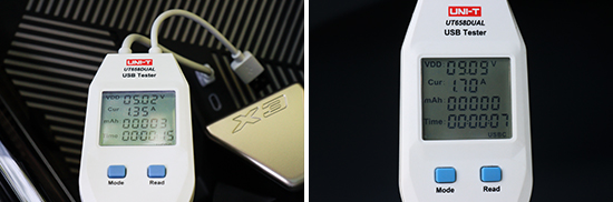 在车内USB接口方面,评测车前排中控台下方配有2个Type-C接口,后排的2个Type-C接口分别位于两个前排座椅后背。虽然数量可观,但是接口单一,适配性一般。车内12V电源接口有2个,分别位于前排中央扶手箱内和后备厢侧面。此外,我们对USB接口的电压与电流进行了测试,前排两个接口的电压均为5V左右,电流能够达到1.35A;后排接口的电压更高,实测在9V左右,电流也提升至1.7A。