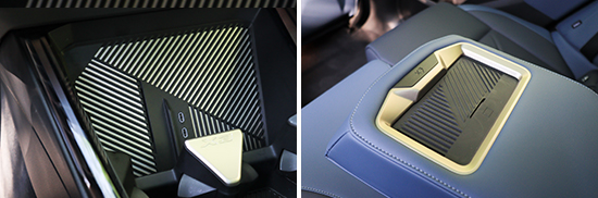 评测车在前排中控台下方和后排中央扶手前端各配有1个手机无线充电板,用户可以通过中控屏内的按键进行开关。充电板底部材质摩擦力较高,搭配凸起明显的纹路,放置手机十分稳妥。虽然散热孔尺寸偏小,但是由于底部的纹路缝隙也能在一定程度上保证空气流通,因此散热表现尚可。