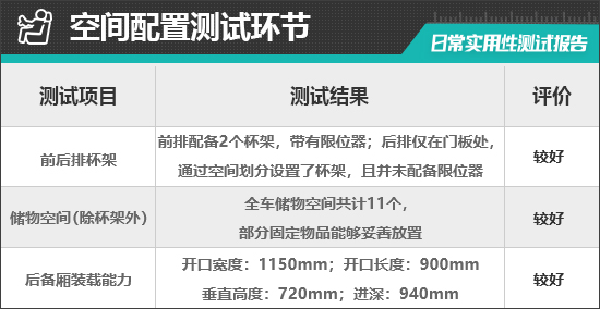 对于车内使用空间的测试,只针对前排触手可及的空间,不包括手套箱、中央扶手箱等需开启的空间。测试方法是将以下固定物品全部放置在前排的各个储物空间内,通过固定物品的放置情况来判断车辆储物空间的表现。测试选定的固定物品为:2瓶常规大小的矿泉水、1部大屏手机、1支口红、1个挎包、1副墨镜、1把折叠雨伞以及1包常规尺寸的抽纸。