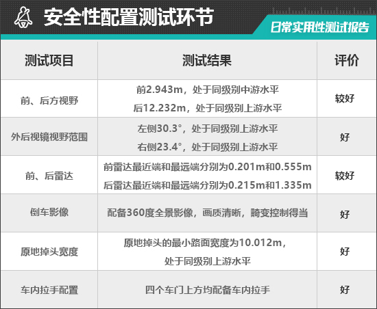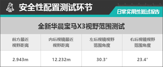 在车辆前、后方视野测试中,车内所有座椅均已调整至最低状态,所测出的数据与驾驶者正常使用时均有一些偏差,仅供参考。