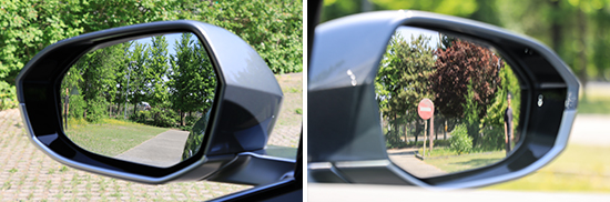 评测车的左/右外后视镜均采用双曲率镜片,实测左外后视镜视野范围为30.3°,右外后视镜视野范围为23.4°。两侧外后视镜视野范围均处于同级别上游水平,整体表现可圈可点。