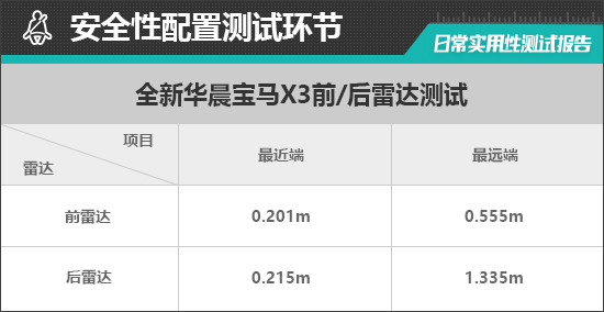 前驻车雷达最远可在0.555m处感应到前方物体,持续蜂鸣阶段提示距离为0.201m,与同级别测试均值略有差距。