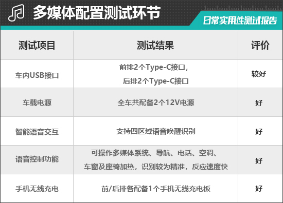 经过实测,由于评测车配备的是全景天幕,因此并不支持开启。除此之外,系统均能识别并执行上述指令,识别率高,反应速度快。评测车支持四区域语音唤醒识别、语音免唤醒词以及语音连续识别等主流功能,日常使用十分方便。