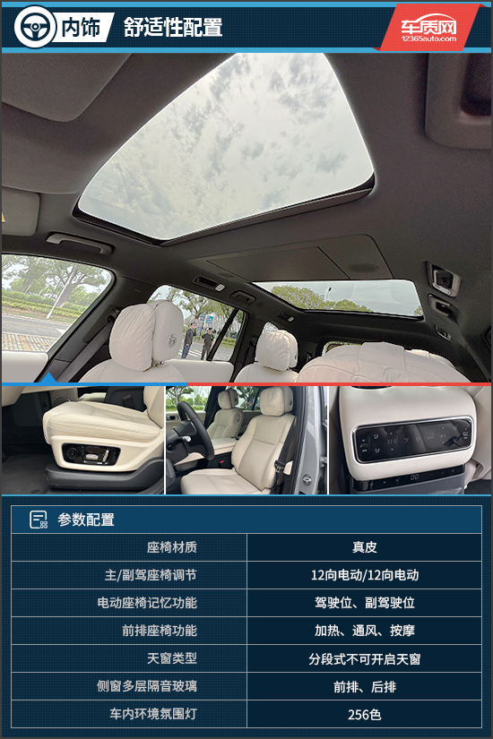 舒适性配置方面,评测车配备分段式不可开启天窗,并提供有物理遮阳帘,可直接避免夏季在车内被暴晒的尴尬局面。座椅采用真皮材质,填充物柔软,前两排座椅头枕软垫十分舒适,第二排还提供了独立座椅,带来了头等舱般的乘坐感受。主/副驾驶座椅均支持12向电动调节,前两排座椅具备加热、通风、按摩功能,整体舒适性配置十分完善。