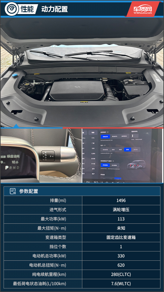 评测车搭载1.5T发动机与前后双电机组成的增程式动力系统,发动机最大功率113kW,电动机总功率为330kW,总扭矩达620N·m。动力电池配备容量为52.3kWh的三元锂电池,CLTC纯电续航里程为280km,CLTC综合续航为1412km。