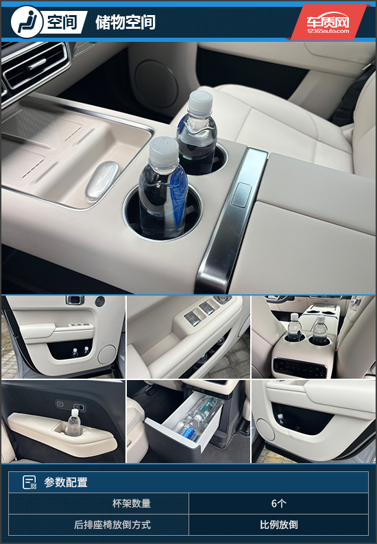 在储物空间方面,评测车表现十分出色。前、中、后三排均配备与乘员数对应的杯架,左右车门的储物格容积也颇为可观,日常使用非常便利。值得一提的是,第二排还配备了车载冰箱,不仅有效扩展了储物能力,还可为乘客提供饮品和食物的保温功能,照顾相当周到。