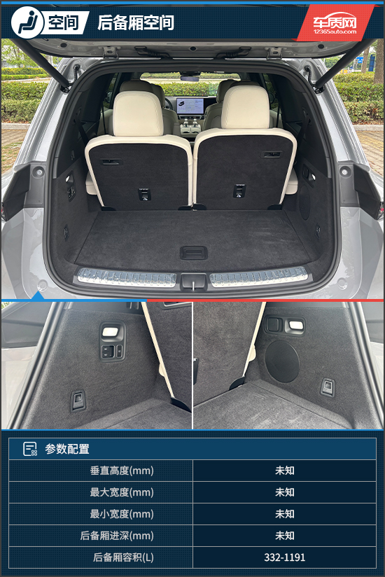 根据官方数据,评测车后备厢常规容积为332L,可扩展至1191L,具备较强的装载灵活性,能轻松应对日常所需。后备厢内部空间十分规整,左右两侧配有照明、锚点及挂钩等实用配置。第三排座椅支持电动放倒,且可通过调节车身高度,进一步提升取放物品的便利性,功能表现相当出色。