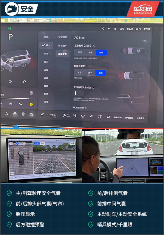 安全配置方面,评测车搭载了丰富的主/被动安全配置。诸如主/副驾驶座安全气囊、前/后排侧气囊、前排中间气囊、主动刹车/主动安全系统、后方碰撞预警在评测车上均有配备,可以有效提升行车安全性。