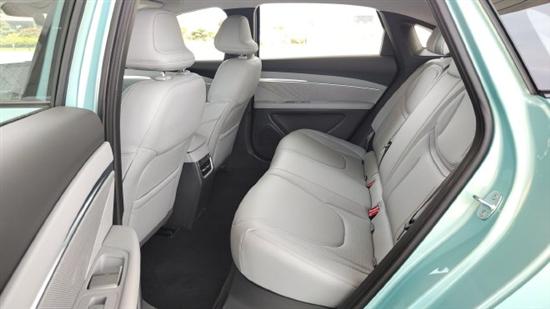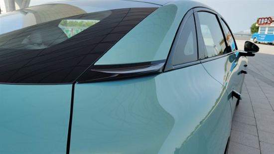 车身侧面,流畅的溜背轿跑线条从车顶一直延伸至车尾,营造出一种优雅而动感的姿态,远看甚至有几分小鹏 P7的神韵,回头率颇高。车身长度为 4780mm,轴距达到 2815mm,虽定位于紧凑型轿车,但其内部空间表现却可媲美传统 B 级车。隐藏式门把手设计不仅使车身侧面更加简洁美观,还能有效降低风阻。