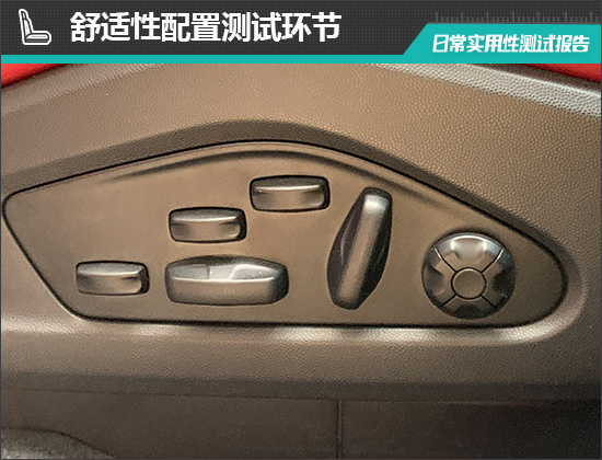座椅方面,评测车主驾驶座椅电动调节按键位于座椅侧面,调节按键位置合理。此外,评测车前排座椅选装了三组记忆功能,前排座椅配备三档加热功能,并选装了三档通风功能,舒适性配置较好。