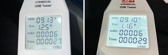 此外,我们对USB接口的电压与电流进行了测试。其中,前排USB Type-C接口的电压和电流分别为9.13V和1.25A;后排USB Type-C接口的电压和电流分别为9.1V和1.16A。