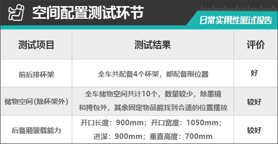 对于车内使用空间的测试,只针对前排触手可及的空间,不包括手套箱、中央扶手箱等需开启的空间。测试方法是将以下固定物品全部放置在前排的各个储物空间内,通过固定物品的放置情况来判断车辆储物空间的表现。测试选定的固定物品为:2瓶常规大小的矿泉水、1部大屏手机、1支口红、1个挎包、1副墨镜、1把折叠雨伞以及1包常规尺寸的抽纸。
