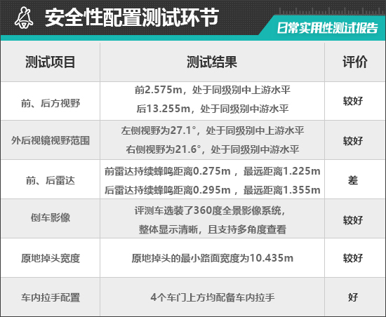 在车辆前、后方视野测试中,车内所有座椅均已调整至最低状态,所测出的数据与驾驶者正常使用时均有一些偏差,仅供参考。