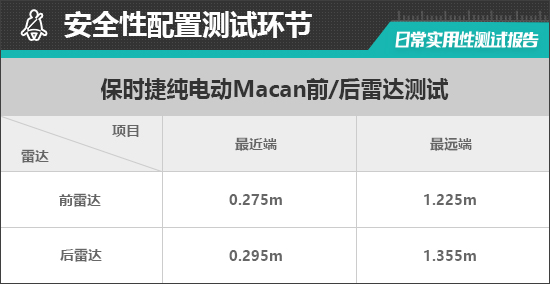 前雷达最远可以在1.225m处感应到前方物体,雷达功率表现较好;持续蜂鸣提示距离为0.275m,表现同样未达到同级别车型平均水平。