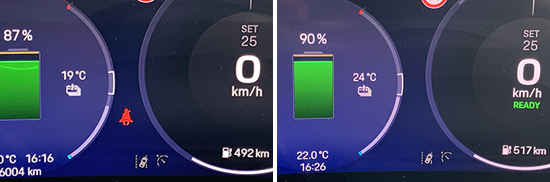 此外,对于充电效率我们也进行了测试。实测使用快充桩充电10分钟后(波峰用电),电量从87%充至90%,续航里程增加25km,与车辆电脑预计的用时基本吻合。