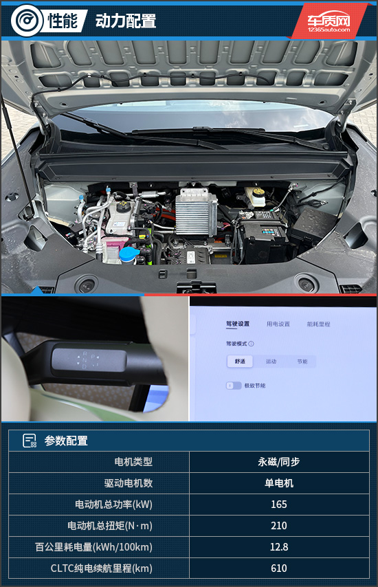 动力方面,评测车搭载前置单电机,电动机总功率为165kW,总扭矩达到210N·m。动力电池方面,选用容量为67.92kWh的磷酸铁锂电池,CLTC纯电续航里程为610km。