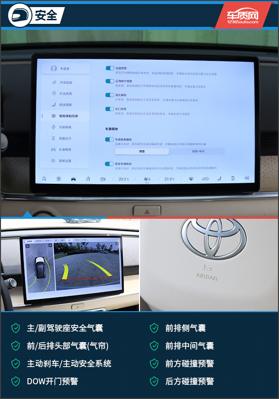 安全配置方面,铂智3X继承了丰田一直以来的安全、安心。评测车搭载了丰富的主/被动安全配置,像是主/副驾驶座安全气囊、前/后排头部气囊(气帘)、前排中间气囊、DOW开门预警、后方碰撞预警等主/被动安全配置均有配备,可以有效提升行车安全性。