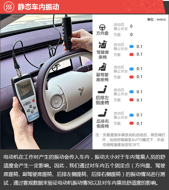 在静态车内振动测试环节,启动后静止和负载两种状态下,2025款firefly萤火虫方向盘位置的振动数值始终为0,前后排座椅在两种状态下的振动数值均为0.1mm/s,实际体感轻微。