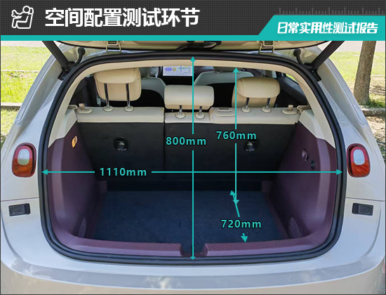 后备厢内部造型较为规整,地板平整度不错。后排座椅支持比例放倒,放倒后可以进一步拓展后备厢空间。对于评测车后备厢的基础数值,我们也进行了实测,开口长度为800mm;开口宽度为1110mm;后备厢进深为720mm;后备厢地台与顶部的垂直高度为760mm。