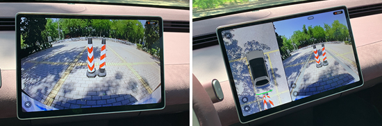 评测车配备了360度全景影像和透明底盘,方便驾驶员查看车辆周边情况。影像清晰度较好,车辆周围的畸变控制也比较合理,整体表现达到行业主流水平。
