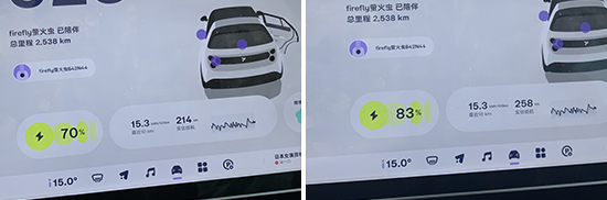 此外,对于充电效率我们也进行了测试。实测人员使用快充桩充电10分钟后(波峰用电),电量从70%充至83%,续航里程增加44km,与车辆电脑预计的用时基本吻合。