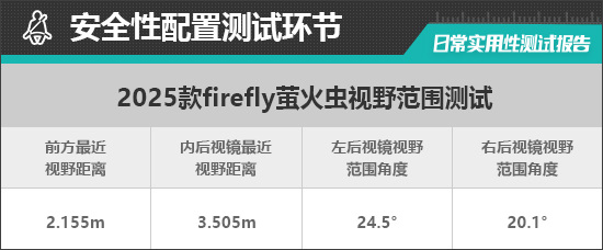 作为一款以高颜值、年轻化为核心卖点的纯电小型车,2025款firefly萤火虫的实用性表现符合预期,特别是在后方视野和右侧外后视镜视野范围方面,表现令人满意;不过,其在车内拉手和杯架数量方面还有提升的空间。综合来看,2025款firefly萤火虫的实用性表现符合预期,可以满足家庭日常使用所需。