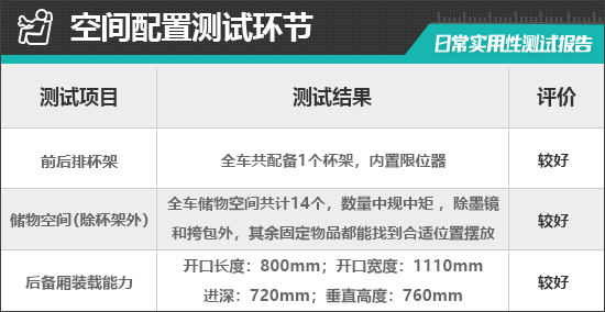 对于车内使用空间的测试,只针对前排触手可及的空间,不包括手套箱、中央扶手箱等需开启的空间。测试方法是将以下固定物品全部放置在前排的各个储物空间内,通过固定物品的放置情况来判断车辆储物空间的表现。测试选定的固定物品为:2瓶常规大小的矿泉水、1部大屏手机、1支口红、1个挎包、1副墨镜、1把折叠雨伞以及1包常规尺寸的抽纸。