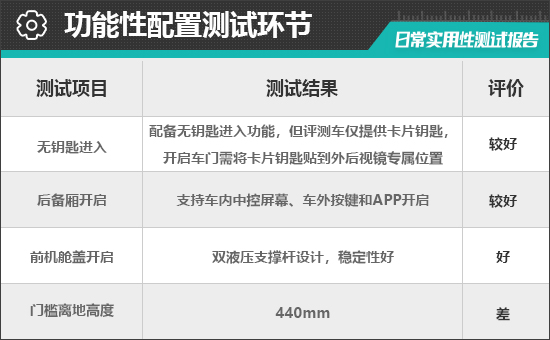 评测车后备厢支持车内中控屏幕、车外按键和APP开启,但不支持感应开启,使用便利性一般。