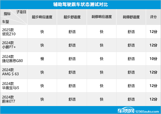在跟车状态测试中,有5款车型获得了满分,捷尼赛思G80也只是在起步响应速度方面略有丢分,整体表现可圈可点。