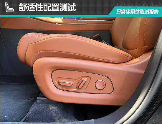 舒适性配置方面,评测车前排座椅调节按键位于座椅侧面,位置设计合理。同时,前/后排座椅均支持加热、通风、按摩功能,主驾驶座椅还配备了头枕扬声器。