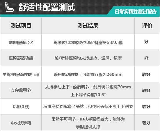 在主驾驶座椅测试中,评测车的驾驶座椅最前端和最末端之间的距离为260mm,处于同级别中游水平。