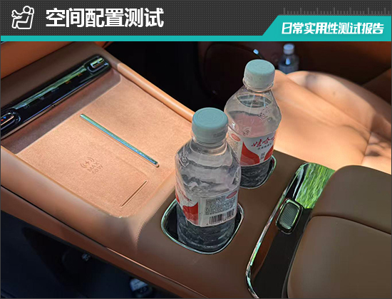 对于车内使用空间的测试,只针对前排触手可及的空间,不包括手套箱、中央扶手箱等需开启的空间。测试方法是将以下固定物品全部放置在前排的各个储物空间内,通过固定物品的放置情况来判断车辆储物空间的表现。测试选定的固定物品为:2瓶常规大小的矿泉水、1部大屏手机、1支口红、1个挎包、1副墨镜、1把折叠雨伞以及1包常规尺寸的抽纸。