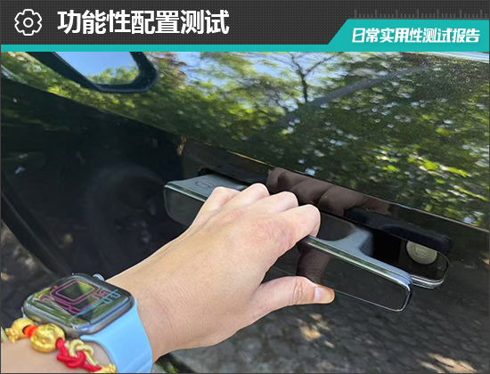 评测车配备前排无钥匙进入功能,并支持遥控钥匙、蓝牙钥匙进入方式。车门把手采用隐藏式设计,当携带遥控钥匙靠近车辆后可感应解锁,并且四个门把手会同时弹出。在实测过程中并未出现失灵或是卡顿情况,实用性表现令人满意。