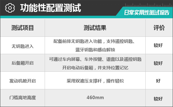 评测车的后备厢支持车内屏幕、车外按键、遥控钥匙以及语音等多种开启方式,支持位置记忆功能,但未提供感应开启,特定场景下会略感不便。