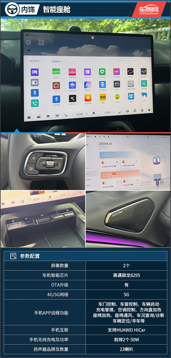 智能座舱方面,评测车配备13.02英寸全液晶仪表、15.4英寸中控屏和25.5英寸AR-HUD增强现实抬头显示,后排还提供两个外接PAD互联磁吸接口。中控屏分辨率达到2.5K,画质鲜艳生动,内置高通骁龙8295芯片和自研大模型AI EVA,支持语音控制、迎宾动画、氛围联动等功能,车机操作流畅无卡顿,语音交互精准且富有情感温度。音响系统方面,全车共搭载23个高保真扬声器,支持杜比全景声,配合驾驶位头枕扬声器与AI调音大师,带来沉浸式听觉体验。