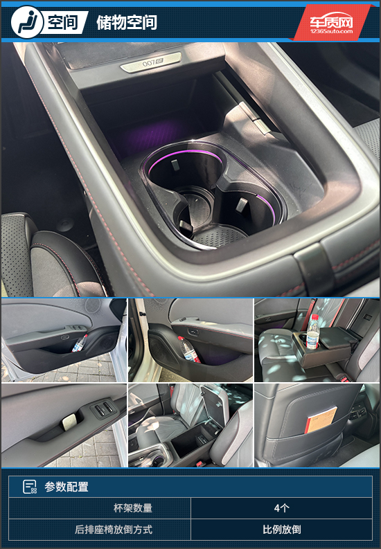 在储物空间方面,评测车能够较好满足日常使用需求。中控岛台前方配备两个手机放置槽且均支持无线充电,下方采用部分掏空设计,中央扶手箱容积则相当可观。此外,后排中央扶手还提供了一个尺寸不小的储物格,便于放置随身物品。