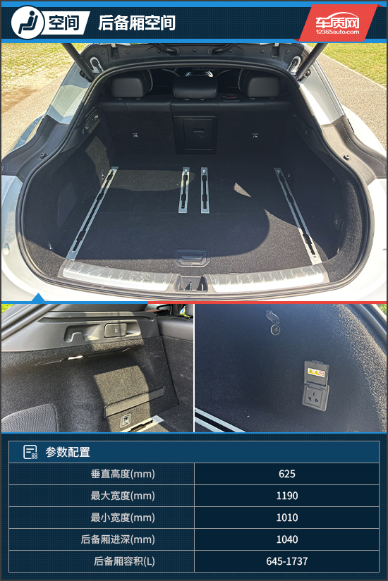 根据官方数据显示,评测车后备厢常规容积为645L,放倒后排座椅后可扩充至1737L,装载空间十分灵活,并可满足日常使用需求。后备厢内部设计非常规整且功能丰富,选装的滑轨和220V交流电源适用于多种生活场景,后排座椅还支持一键放倒,瞬间完成空间拓展。