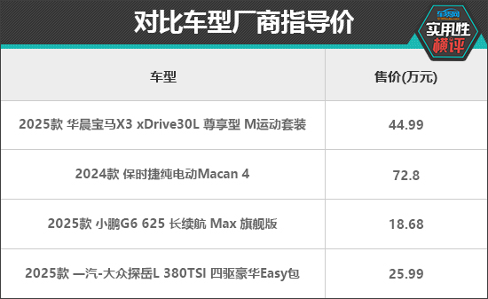 在当下的汽车消费潮流中,中型SUV凭借其均衡的空间表现、灵活的驾控体验以及出色的多功能性,正日益成为家庭用户和都市精英的首选车型。在往期的“日常实用性测评”中,我们曾测试过多款中型SUV,此次我们将聚焦于华晨宝马X3、保时捷Macan新能源、小鹏G6以及一汽-大众探岳L这四款车型。通过实测数据的直观对比,为您揭晓哪款产品在实用性方面更具综合优势。