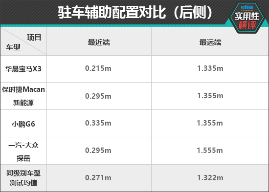 在后驻车雷达测试中,四款车型的最远端探测距离均超过了同级别车型测试均值,雷达功率表现相对较好。最近提示距离方面,保时捷Macan新能源和一汽-大众探岳L与同级别车型测试均值最为接近。