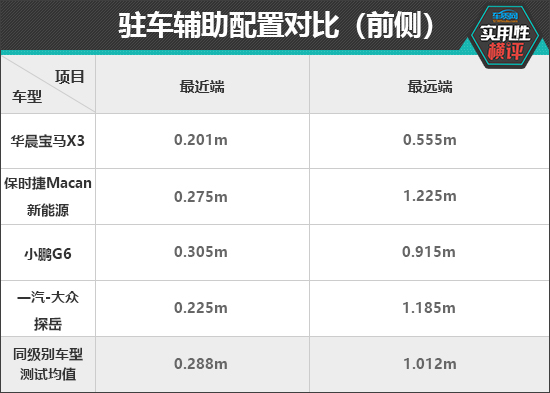 驻车辅助配置方面,在前驻车雷达测试中,根据已有测试数据来看,保时捷Macan新能源和一汽-大众探岳L最远探测距离均超过同级别车型测试均值,雷达功率表现不错。最近提示距离方面,四款车或多或少与测试均值存在差距,其中华晨宝马X3与测试均值偏差较大。