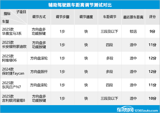 在车速调节项目中,6款车型调节方式不尽相同,2025款华晨宝马3系(以下简称:华晨宝马3系)和2025款吉利银河星耀8(以下简称:吉利银河星耀8)采用方向盘多功能按键操作;长安福特蒙迪欧和保时捷Taycan采用方向盘拨杆操作;而阿维塔06和2025款东风日产N7(以下简称:东风日产N7)则采用方向盘滚轮操作。具体来看,6款车型在调节步骤和调节速度方面表现一致,而在调节幅度方面,只有东风日产N7不支持多车速调节,导致其出现失分情况。