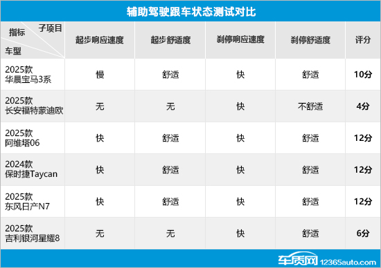 在跟车状态测试中,阿维塔06、保时捷Taycan和东风日产N7均获得满分,整体表现出色。相对而言,长安福特蒙迪欧和吉利银河星耀8均不支持自动跟车起步功能,因此在起步响应速度和舒适度两项未获得分数。此外,长安福特蒙迪欧由于在刹停舒适度方面表现不尽如人意,导致其得分垫底。