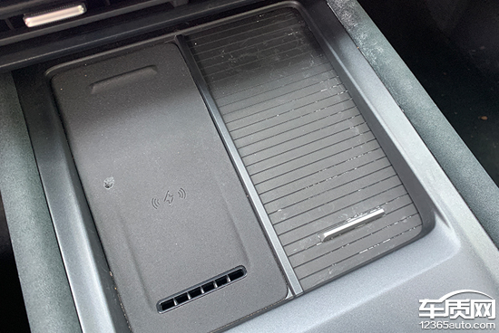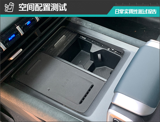 评测车在前排中控台下方配备了1个手机无线充电板,位置设计合理,驾驶员拿放手机方便。充电功率为50W,并提供通风散热口和开启/关闭功能,实用性不错。