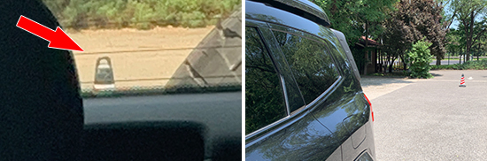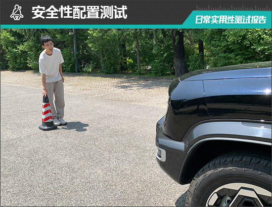 在测试前方视野环节,我们采用高70cm的桩桶作为参照物,随后调整车距,直至在主驾驶位可以看到桩桶上沿。经过测试,桩桶与车头最终测得的数据为2.835m,在测试过的同级别车型中处于中上游水平。