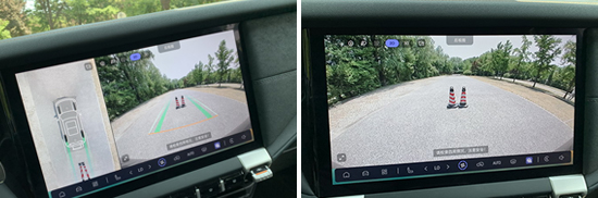 评测车配备了360度全景影像和透明底盘/540度影像,方便驾驶员查看车辆周边情况。影像清晰度较好,车辆周围的畸变控制也比较合理,整体表现达到行业主流水平,能够减轻泊车时的压力。